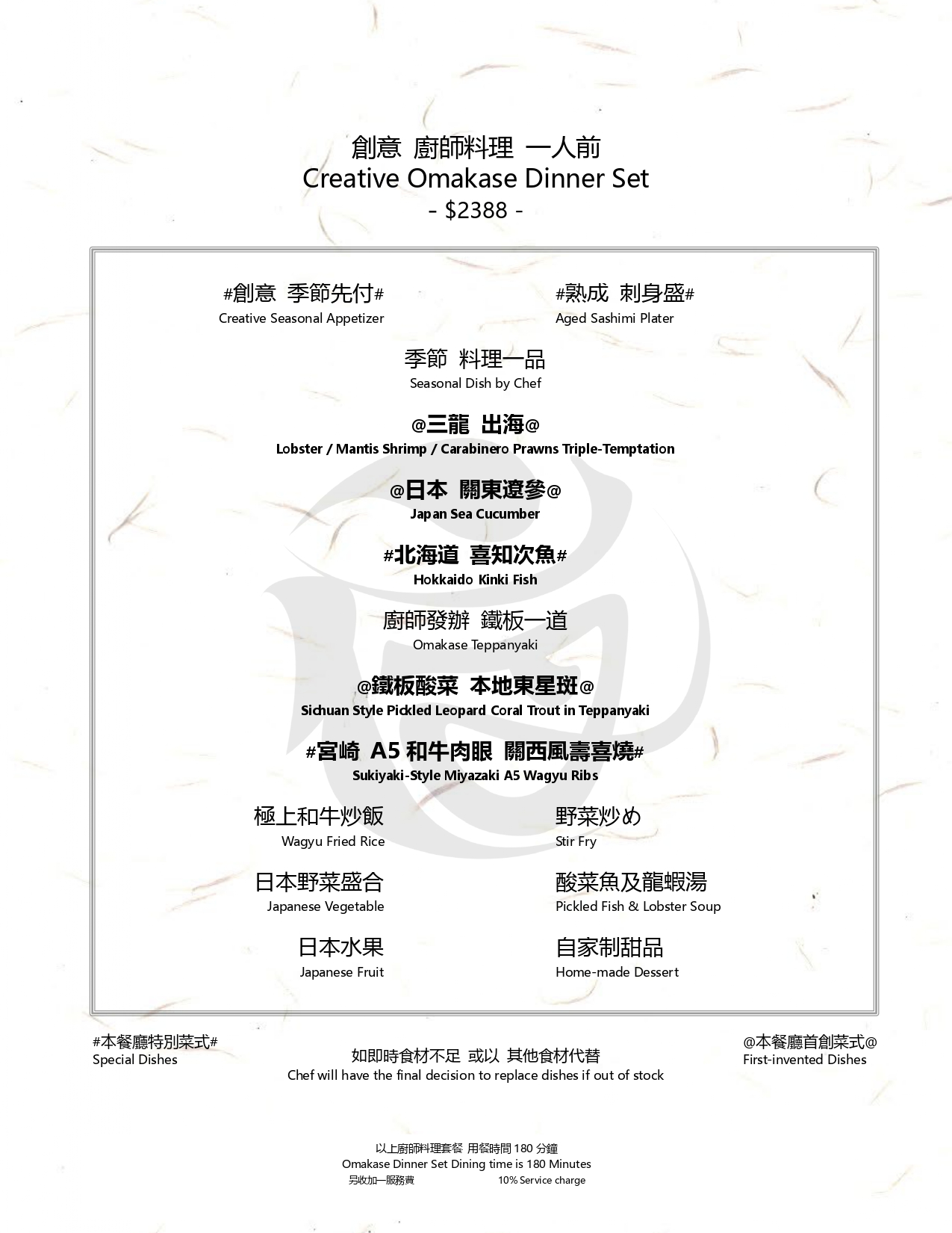 以上廚師料理套餐 用餐時間180分鐘